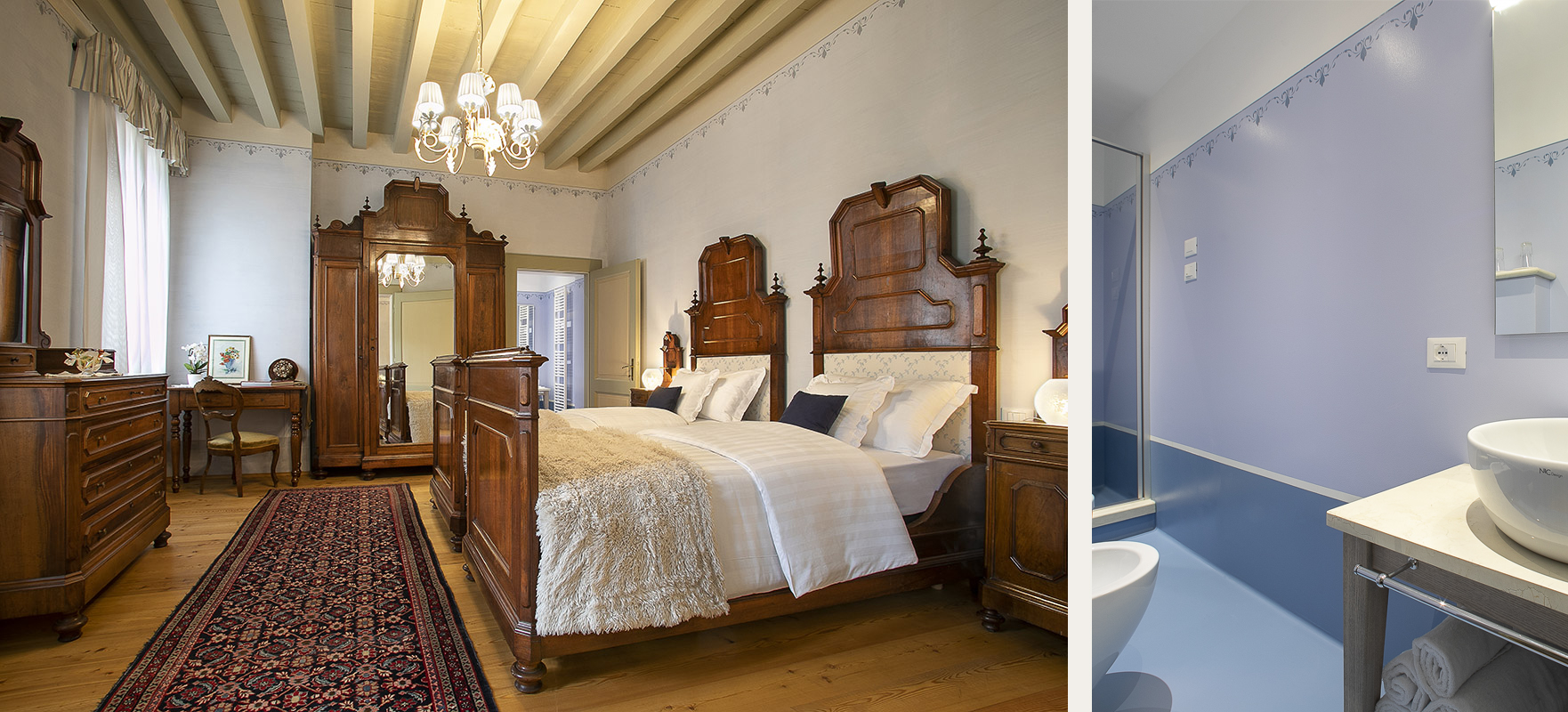 Il minuzioso restauro della Villa ha riportato lo splendore nelle due camere ricavate al piano mansardato. la mansarda gialla è un nido raffinato dove il legno avvolge in una romantica e calda atmosfera e dove l’originale soffitto travato sorprende con la sua antica bellezza. L’armadio è decorato a mano da artisti locali di un tempo e il panorama che si apre affacciati alle tre finestre quadrilobate regala una sensazione di benessere e dolce accoglienza.