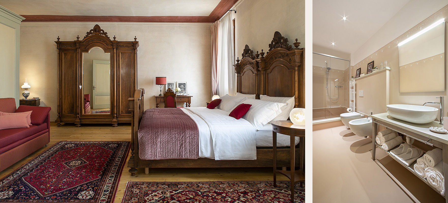 Affacciata sull’antico giardino, luminosa, con ampi orizzonti e piacevoli panorami, la camera rossa è sinonimo di relax, benessere e quiete.