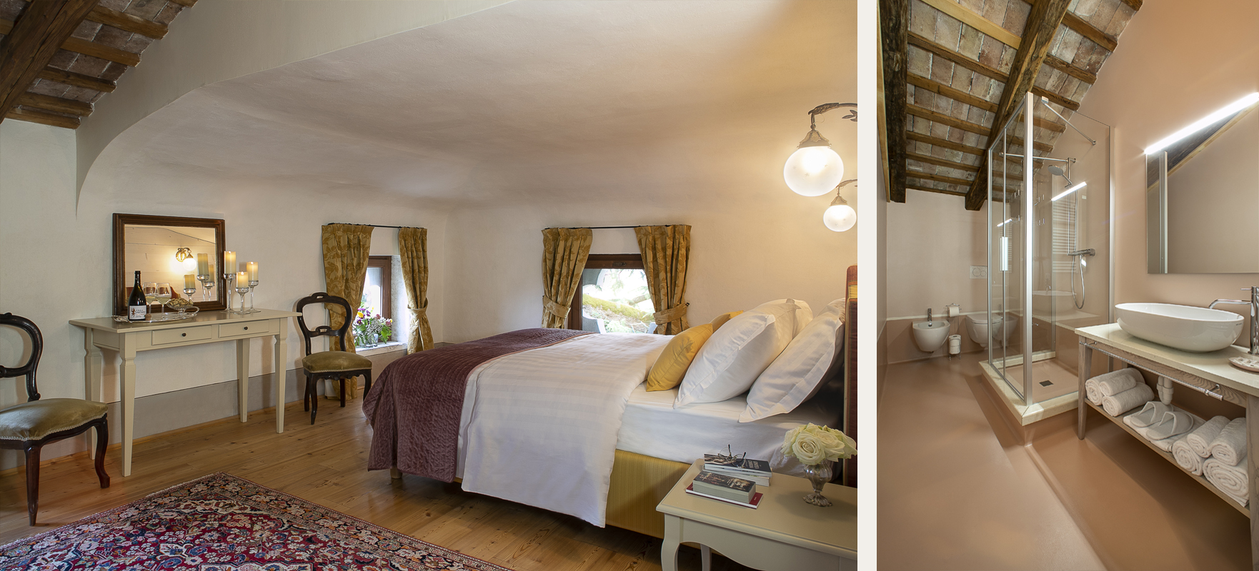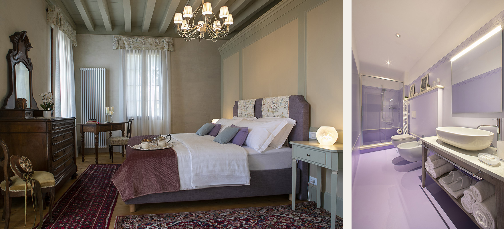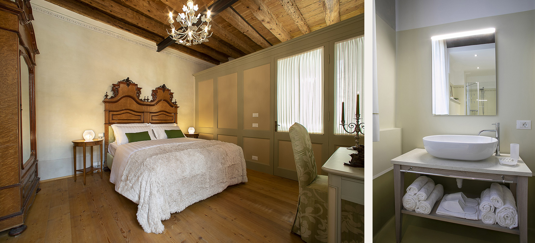 Intima, silenziosa, rilassante, rivolta a nord: la camera verde guarda all’antica corte e riporta alla vita agreste di un tempo, vocata alla campagna, fatta di stagioni e di paesaggi mutevoli, di mansioni e devozione amorevole per la natura.
