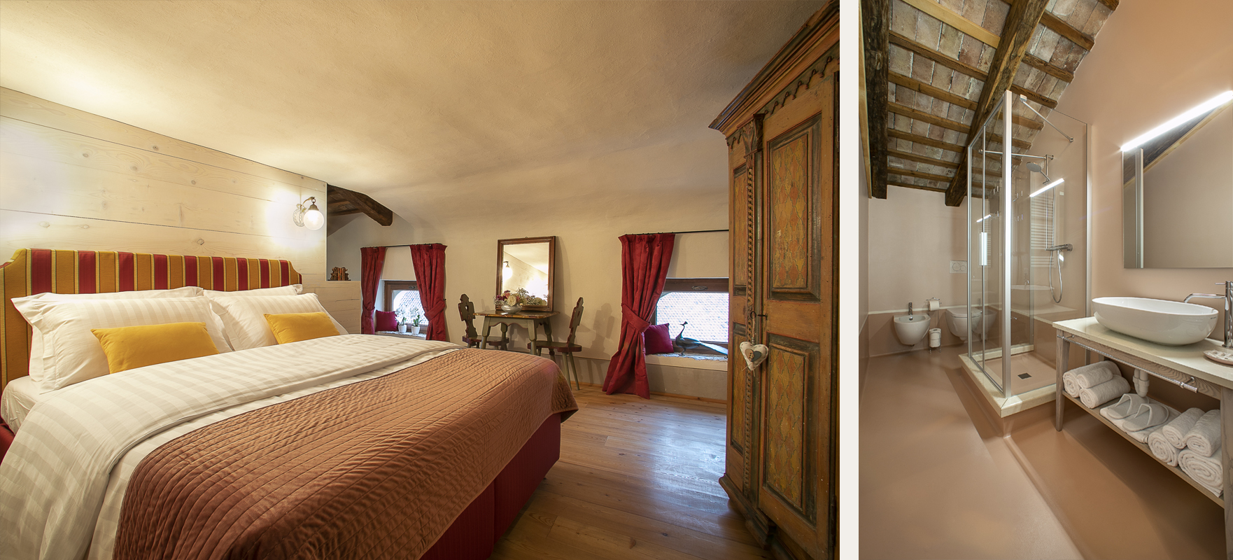 Opposta alla mansarda gialla, la mansarda rossa si affaccia a ovest sulla loggia e a nord sui pendii del Monte Tomba. Lo stile è montano e richiama il bosco, l’accoglienza alpina, con un calore e una riservatezza che raccontano lo stile e la cura per ogni dettaglio. Nella mansarda rossa apprezzerete l’autentico relax, in un angolo di mondo che è solo vostro.